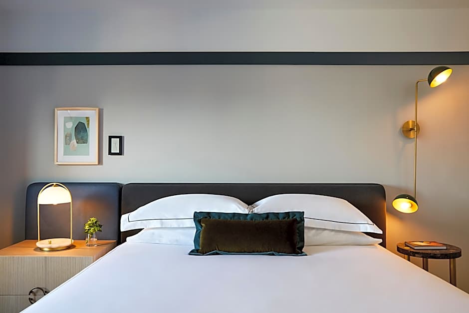 This room offers a mini-bar with gourmet local treats, Frette Linens, in-room Gaiam yoga mats, Atelier Bloem bath amenities and windows that open.